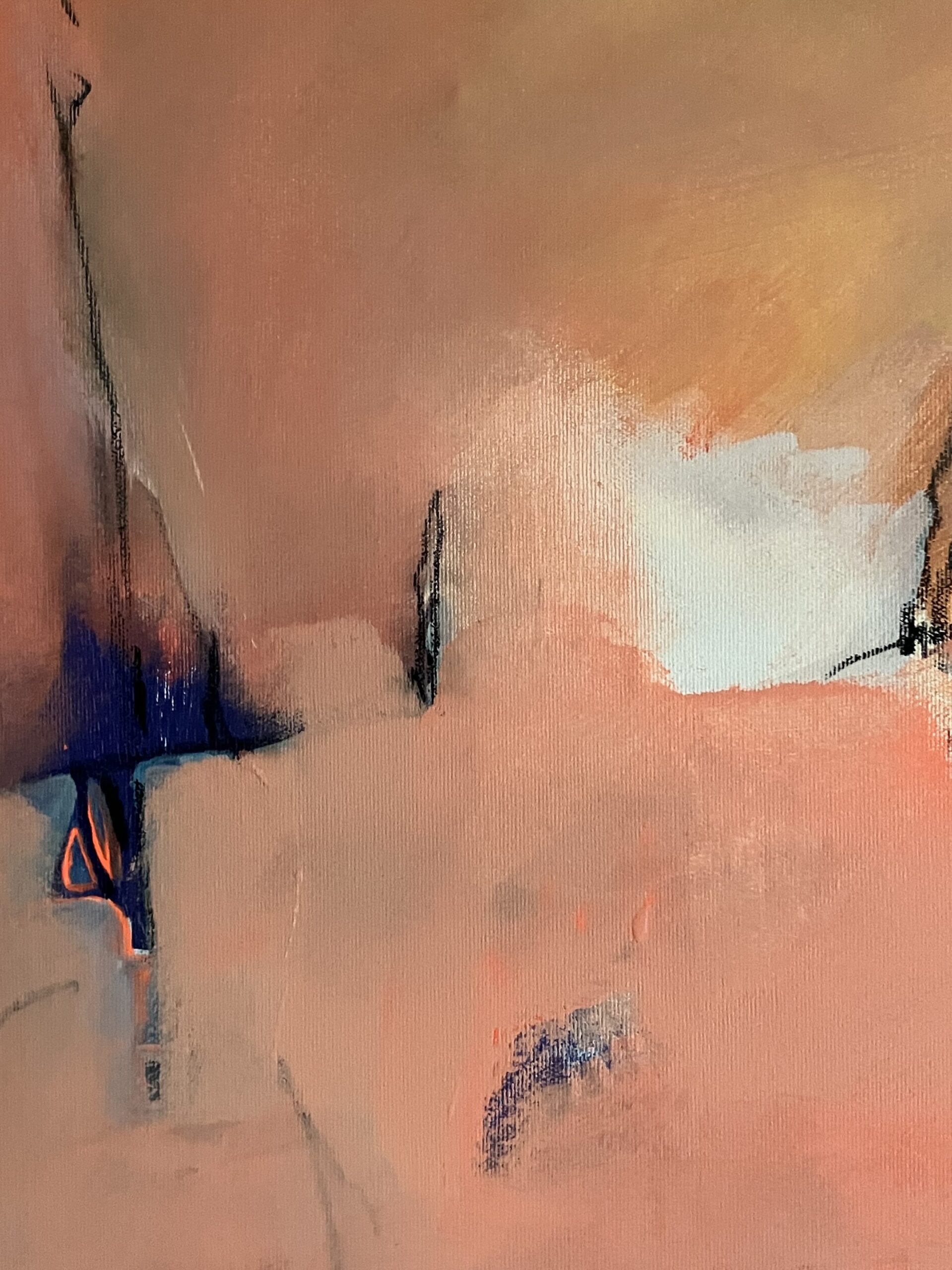 Layers of colour are intersected by drawn lines and punctuated with chromatic accents. The process favours “painted sketches”: immediacy and revision co-exist on the surface.